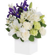 Gorgeous white lilies and delicate blue iris dance gracefully with white roses , white alstroemeria and soft lime carnations in this luxurious arrangement.